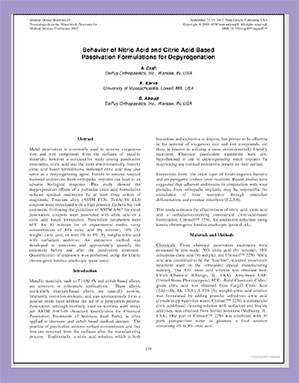 | "金属钝化通常用于去除金属材料表面的外源铁和铁化合物。然而,一项对钝化处理、硝酸以及一种更环保的柠檬酸配方进行的对比研究表明,柠檬酸也可作为解毒剂使用。未能清除骨科植入物中的残留细菌内毒素会导致不良的生物反应。本研究表明,使用特定的柠檬酸配方可将残留内毒素水平降低至少三个数量级。将高活性大肠杆菌内毒素接种到钛合金(ASTM F136.Ti-6AL-4V ELI)试样中。钝化参数按照ASTM A967金属钝化处理指南进行。所有测试介质均在60°C下处理30分钟"。 | |