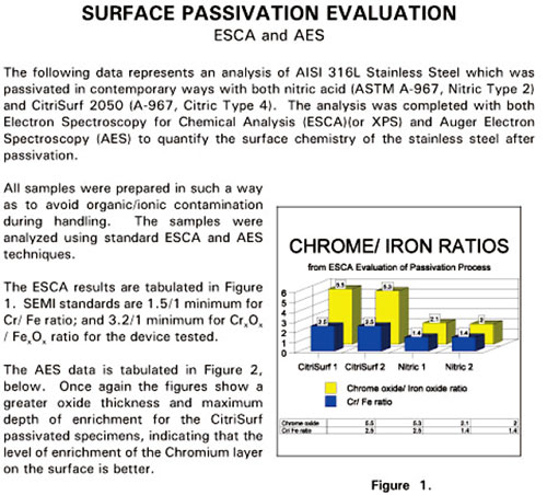 以下数据展示了采用现代方法,分别使用硝酸(ASTM A-967,硝酸2型)和CitriSurf 2050(A-967,柠檬酸4型)对AISI 316L不锈钢进行钝化处理的分析结果。该分析采用电子化学分析光谱法(ESCA)(或XPS)和俄歇电子能谱法(AES)对钝化后不锈钢表面的化学成分进行定量分析。