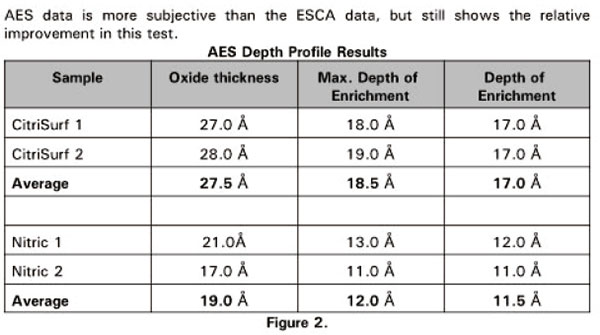 图 2 以表格形式展示了 AES 数据。这些图表还显示,经 CitriSurf 处理的样品具有更厚的氧化层、最深的富集深度以及更优异的表面铬层富集效果.